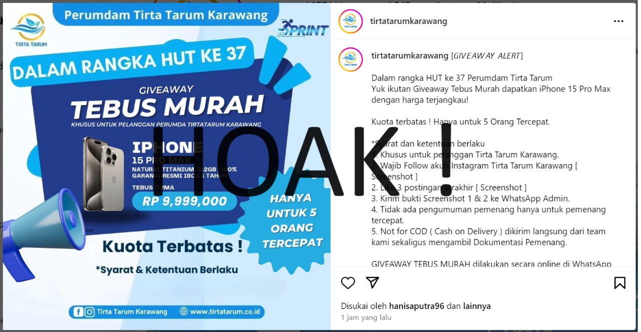 “Sekitar pukul 16.30 WIB, Rabu, 15 Mei 2024, akun Perumdam memposting dan membuat cerita Instagram yang mengumumkan giveaway iPhone 15 Pro Max dalam rangka HUT Perumdam Tirta Tarum Karawang yang ke-37,”terang Ali.