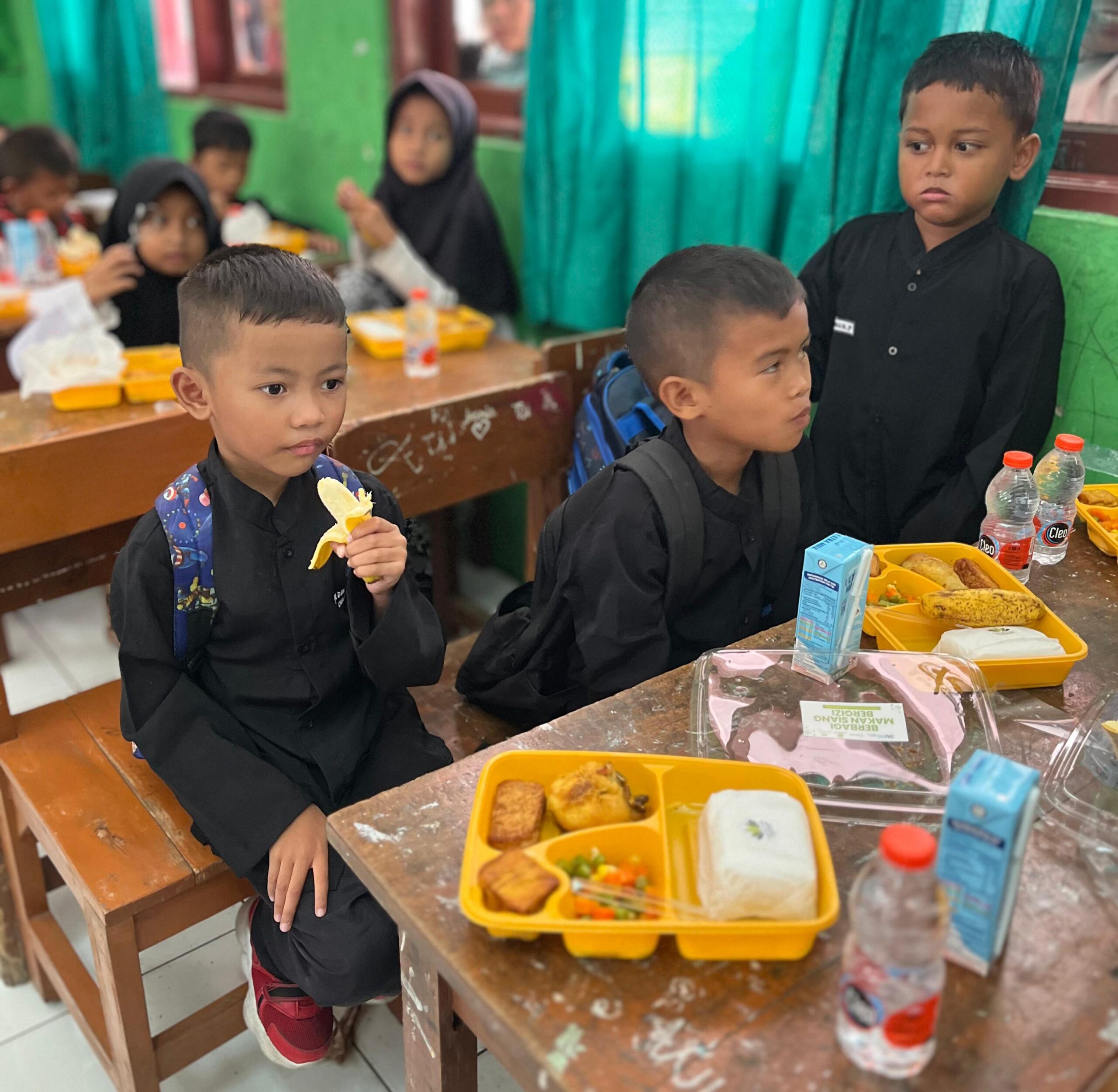 “Dagingnya enak, susunya segar!” ujar Adam, siswa kelas 1 SDN Dawuan Barat I, dengan wajah sumringah usai menyantap paket makanan siangnya.