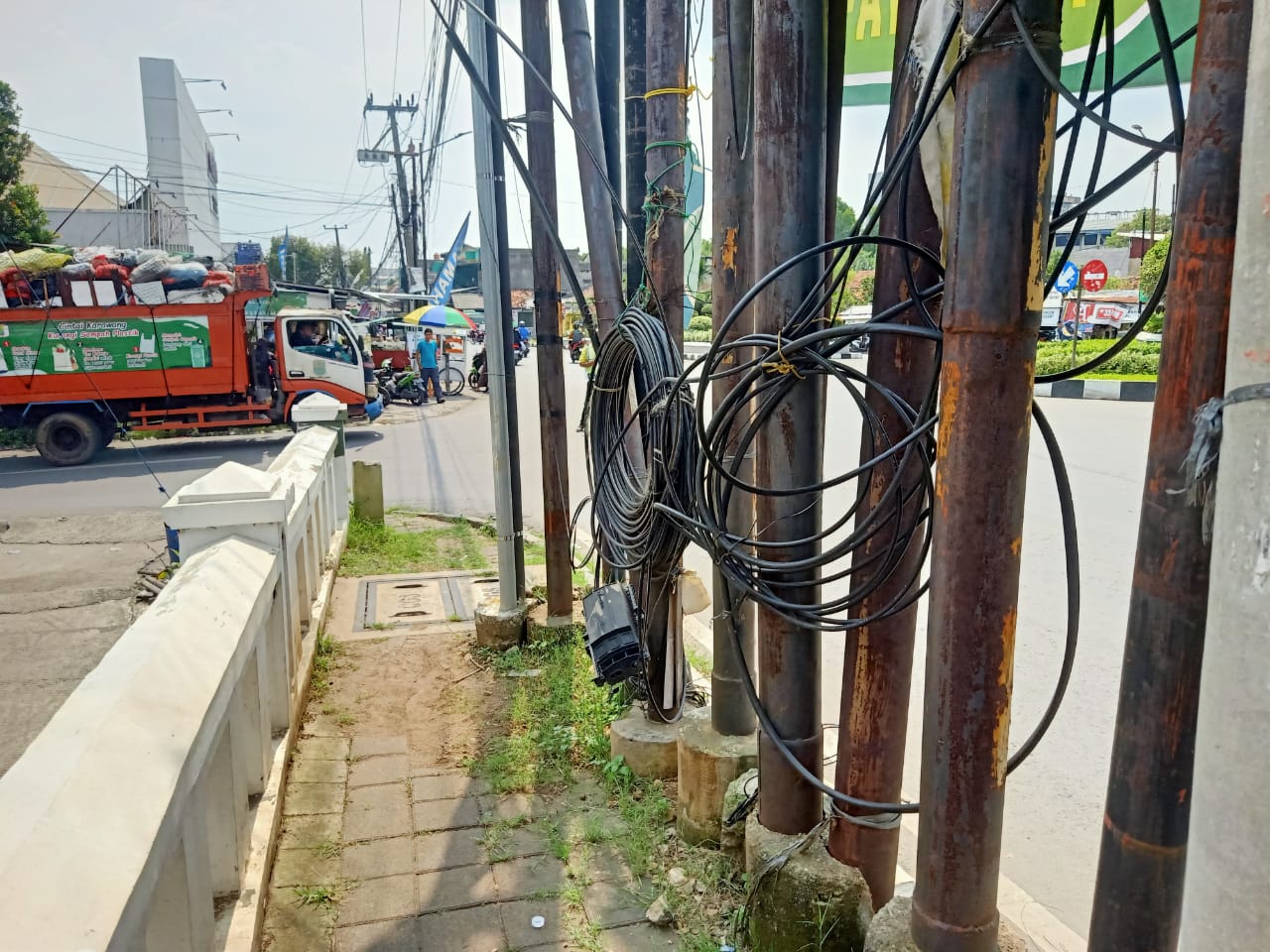 Pantauan pewarta pada Jumat (25/4/2025), kabel-kabel tersebut menggantung rendah di sepanjang trotoar hingga ke area bunderan Telukjambe dan memasuki jalur kendaraan. Di beberapa titik, kabel digulung sembarangan dan diikat ke tiang listrik.