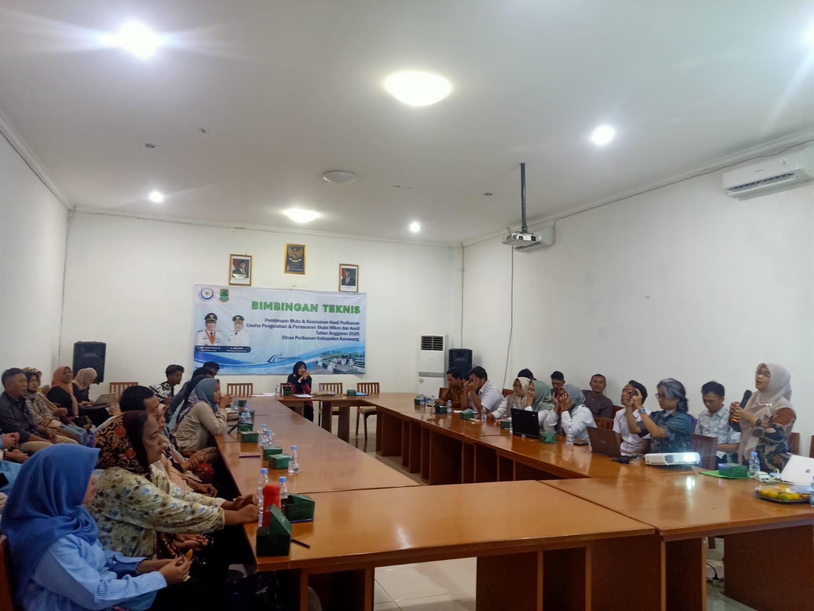 Kegiatan ini berlangsung di Aula Dinas Perikanan Kabupaten Karawang dan diikuti oleh 35 peserta yang terdiri dari 28 pelaku usaha olahan perikanan (UMKM/Poklahsar) dan 7 penyuluh perikanan.