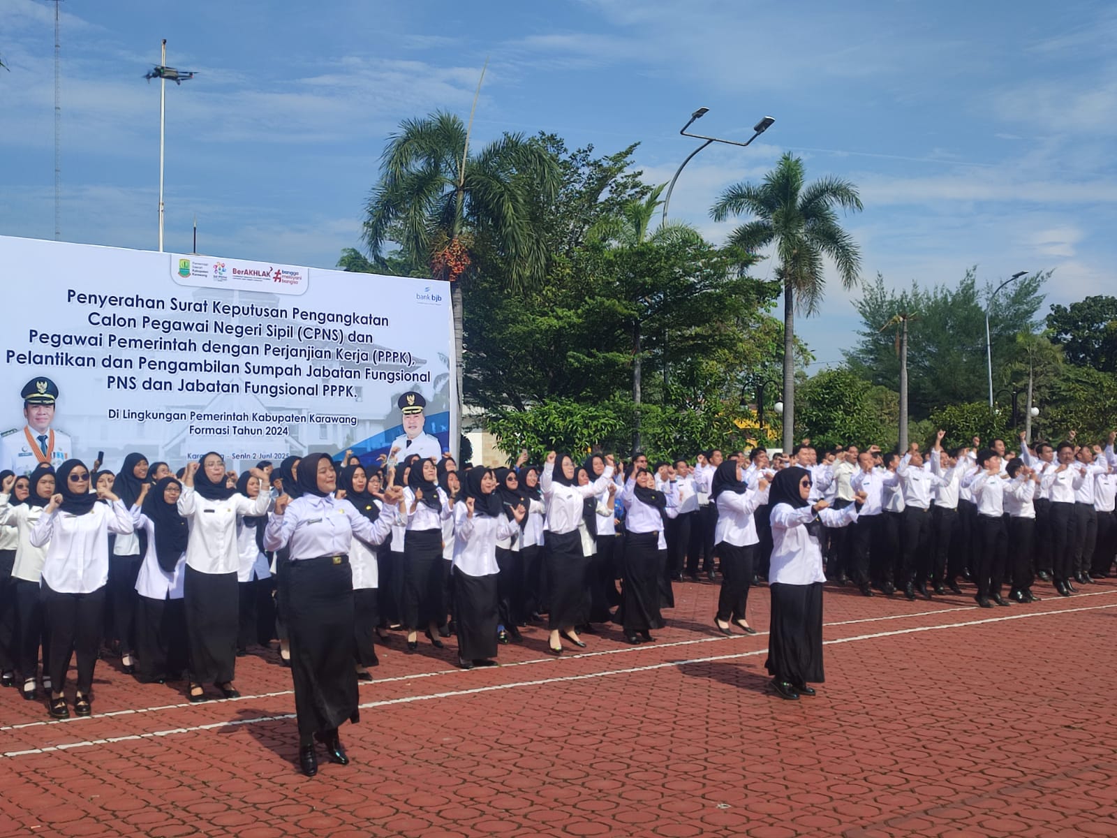 KARAWANG, Jabartime.com – Pemerintah Kabupaten Karawang secara resmi menyerahkan Surat Keputusan (SK) pengangkatan bagi Calon Pegawai Negeri Sipil (CPNS) dan Pegawai Pemerintah dengan Perjanjian Kerja (PPPK) dalam sebuah apel yang dilaksanakan pada Senin (2/6/2025). Acara tersebut dipimpin langsung oleh Bupati Karawang, Aep Syaepuloh.