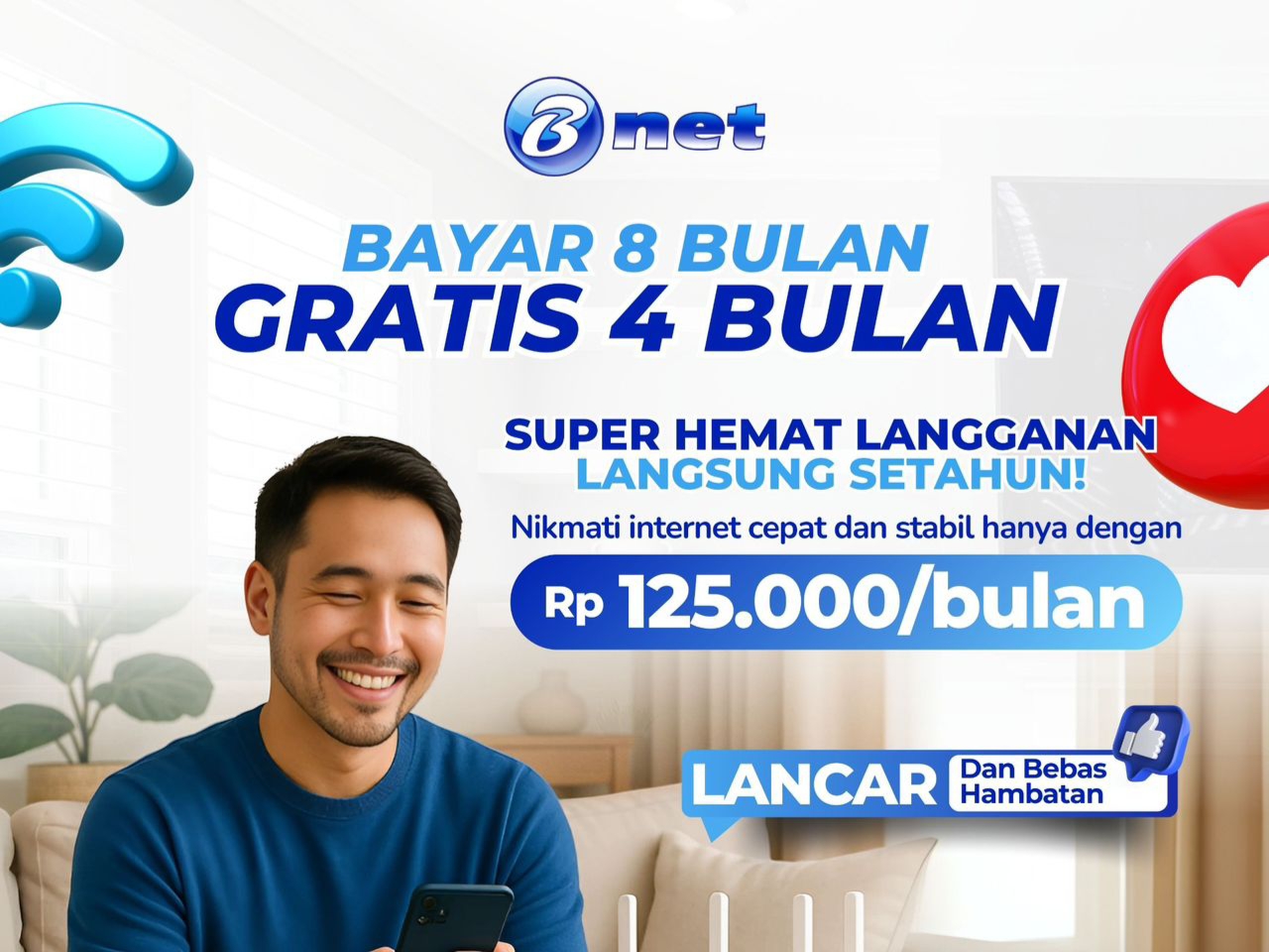 KARAWANG, Jabartime.com – BNET, penyedia layanan internet asli Karawang, kembali menghadirkan promo menarik bagi pelanggan baru. Lewat program spesial “Bayar 8 Bulan, Gratis 4 Bulan,” pelanggan cukup membayar Rp2.000.000 untuk menikmati internet selama 12 bulan penuh.
