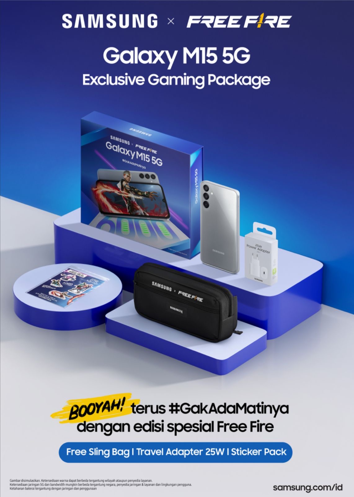 “Dalam Gaming Package itu sendiri terdiri dari unit Galaxy M15 5G, sling bageksklusif Samsung x Free Fire, sticker pack Free Fire edition, Free Fire in-game item, dan travel adapter 25W, dengan bonus e-voucher Grabfood Rp 100.000,” Ungkap
