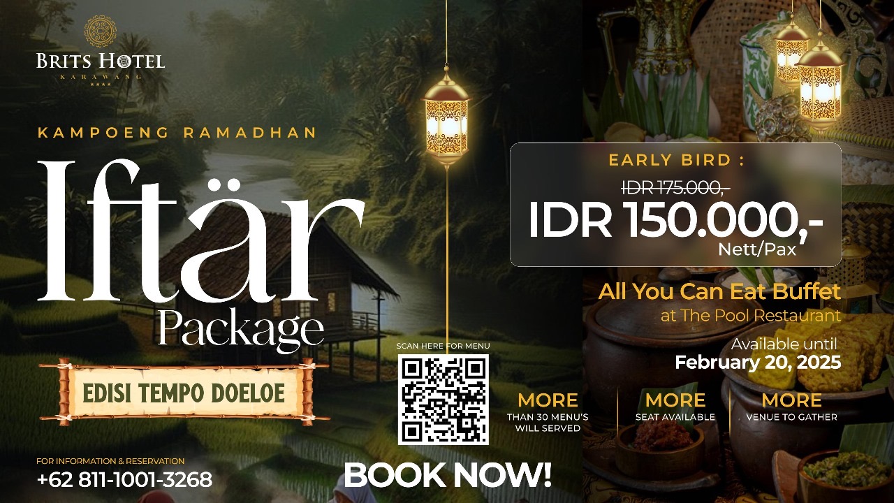 Mr. Fifti Politika, Executive Chef Brits Hotel Karawang mengungkapkan, promo spesial ini menghadirkan konsep suasana berbuka puasa bernuansa masa lampau “Tempo doeloe” dengan menyajikan makanan tradisional Indonesia, serta berbagai fasilitas yang menjamin kenyamanan para tamu.