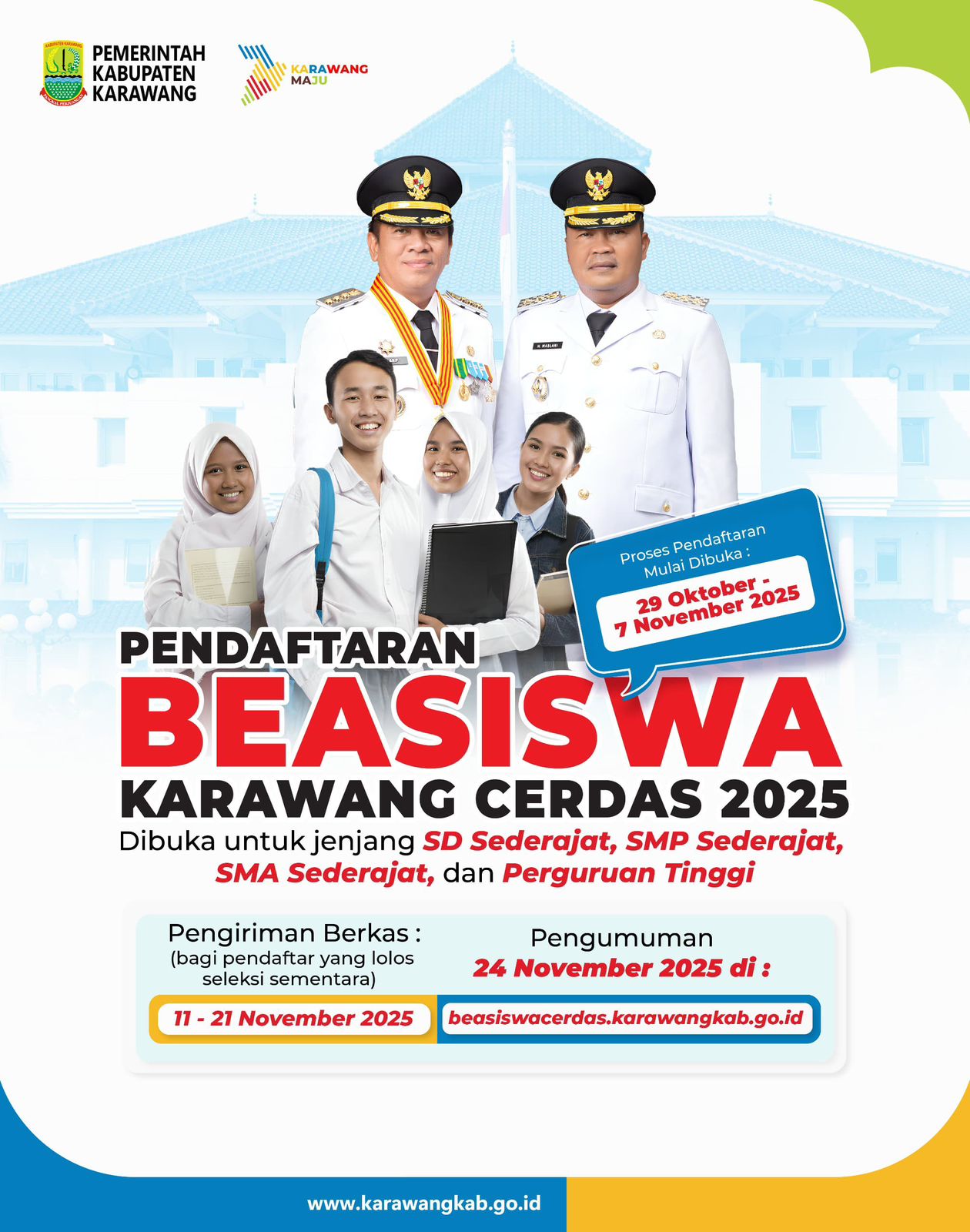 Kepala Bagian Kesra Setda Karawang, Irlan Suarlan, mengatakan bahwa pendaftaran Beasiswa Karawang Cerdas tahun ini dibuka mulai 29 Oktober hingga 7 November 2025 melalui laman resmi beasiswacerdas(dot)karawangkab(dot)go(dot)id.